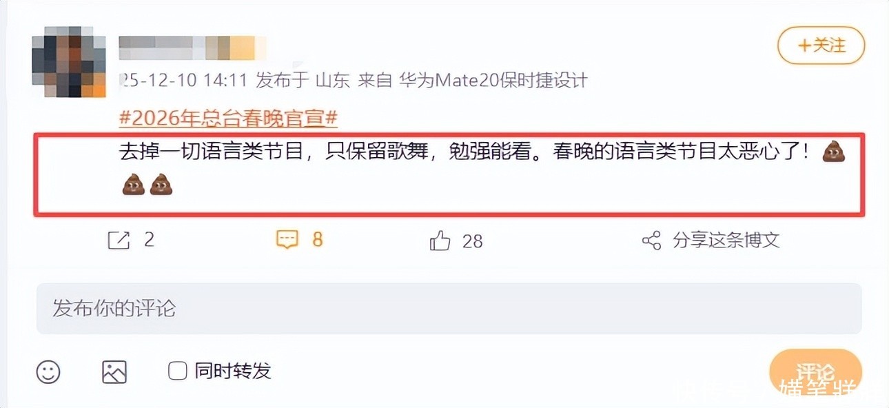 打开春晚官方微博的评论区,本想寻找一些关于“今年小品能否少些说教桥段”“马年歌舞能否融入更多非遗元素”的理性探讨,结果十句话里有八句全是粉丝刷屏式的应援口号。